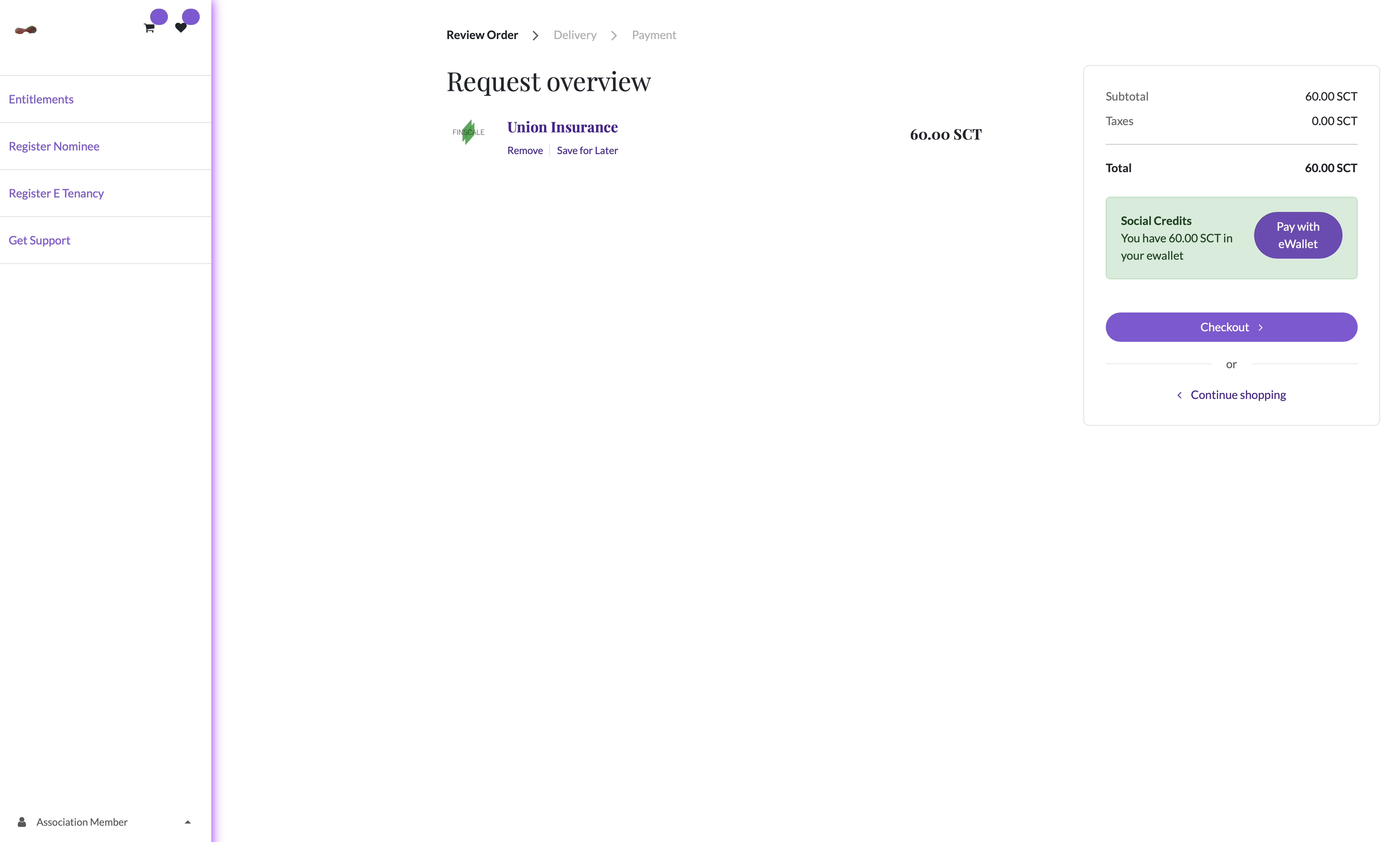 Social Credits are granted to every Association member. You can use the social credits in your E Wallet to complete checkout requests for eligible Entitlements.